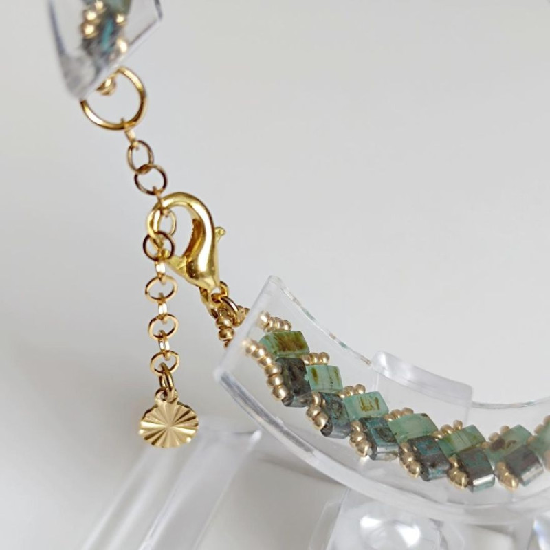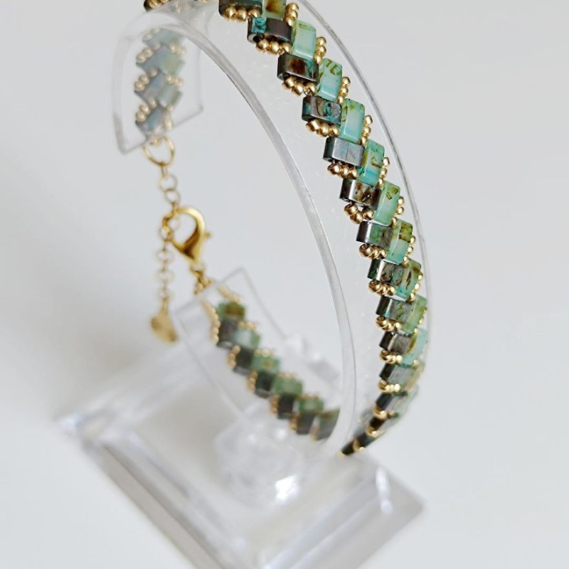 Magnifique bracelet fantaisie Perles Half Tila Miyuki en verre couleur vert Picasso. Perles de rocaille verre couleur or. Fermoir, anneau, chaînette et breloque en acier inoxydable doré.