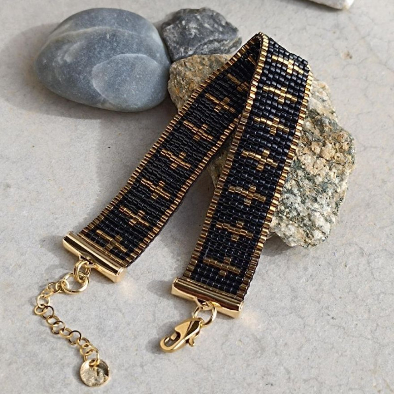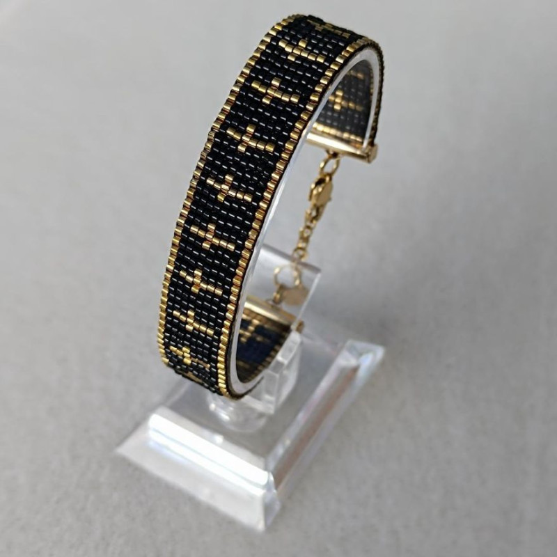 Très joli bracelet fantaisie tissé, perles en verre noires et dorées de marque Miyuki. Accessoires en acier inoxydable doré - Fait main avec amour et passion. Vous aurez beaucoup de plaisir à porter ces créations ou à les offrir.