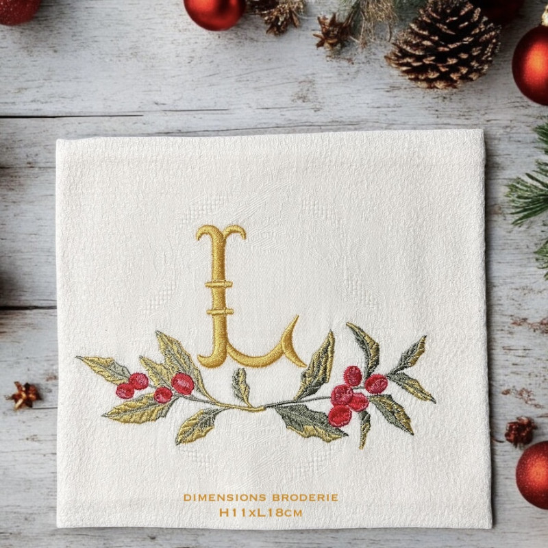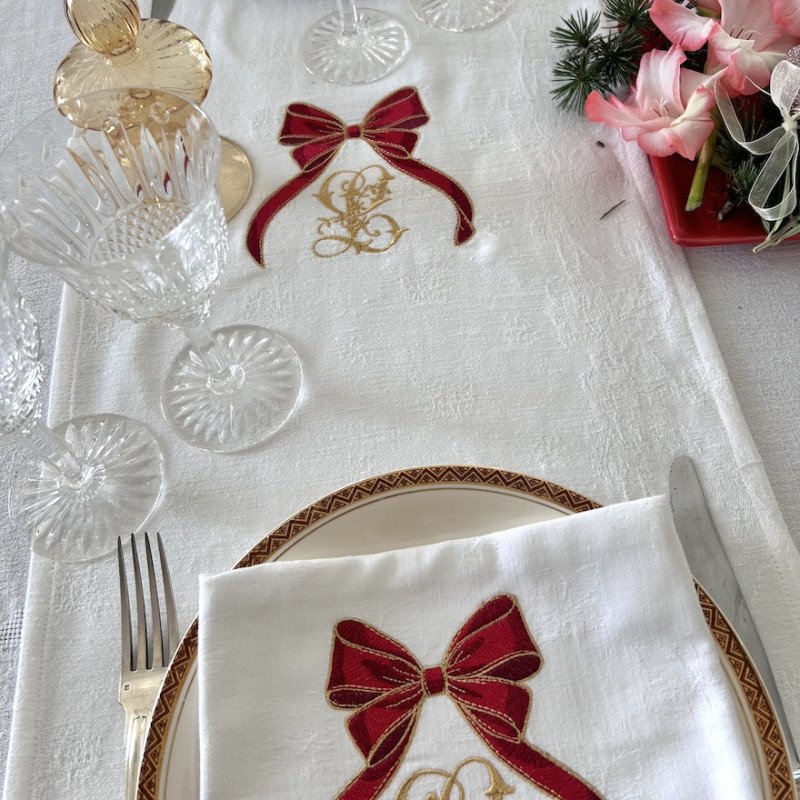 Chemin de table brodé prénom ou initiale damassé lin vintage. Broderie de NOËL. Pour une décoration de table chic & authentique - Offert à partir de 4 chemin de table un joli pochon confectionné dans du tissu ancien. Pour offrir ou se faire plaisir!