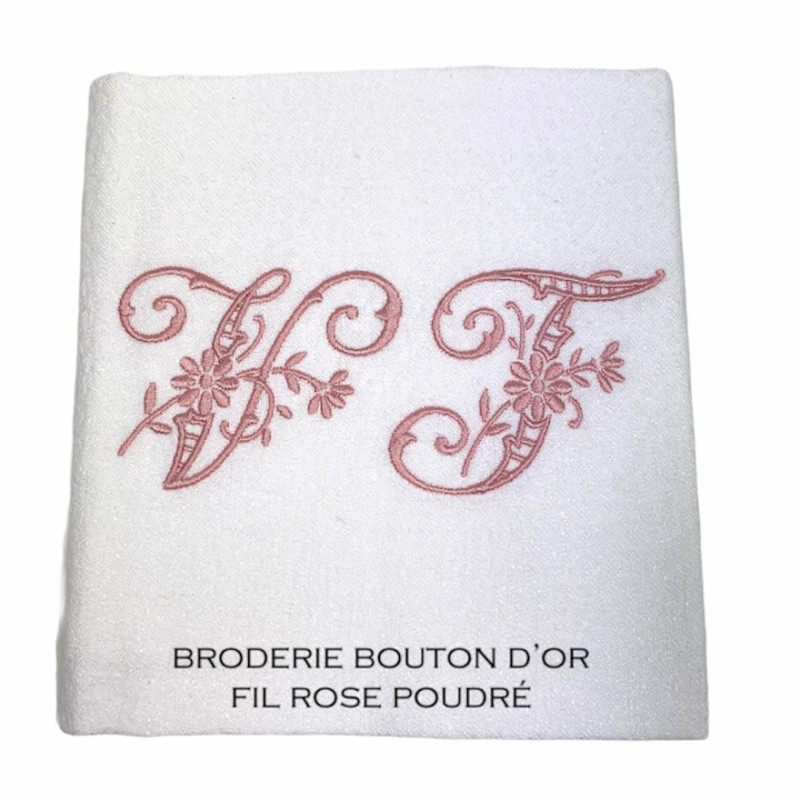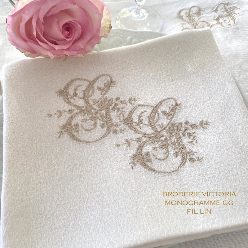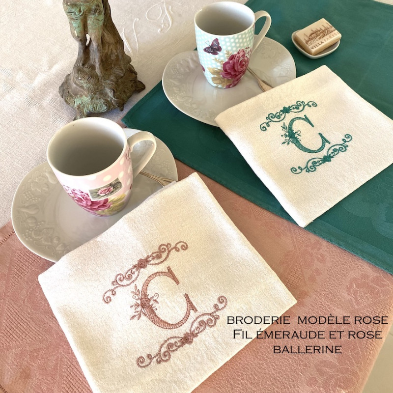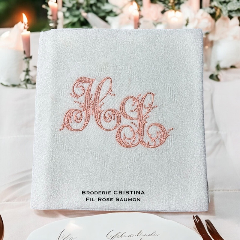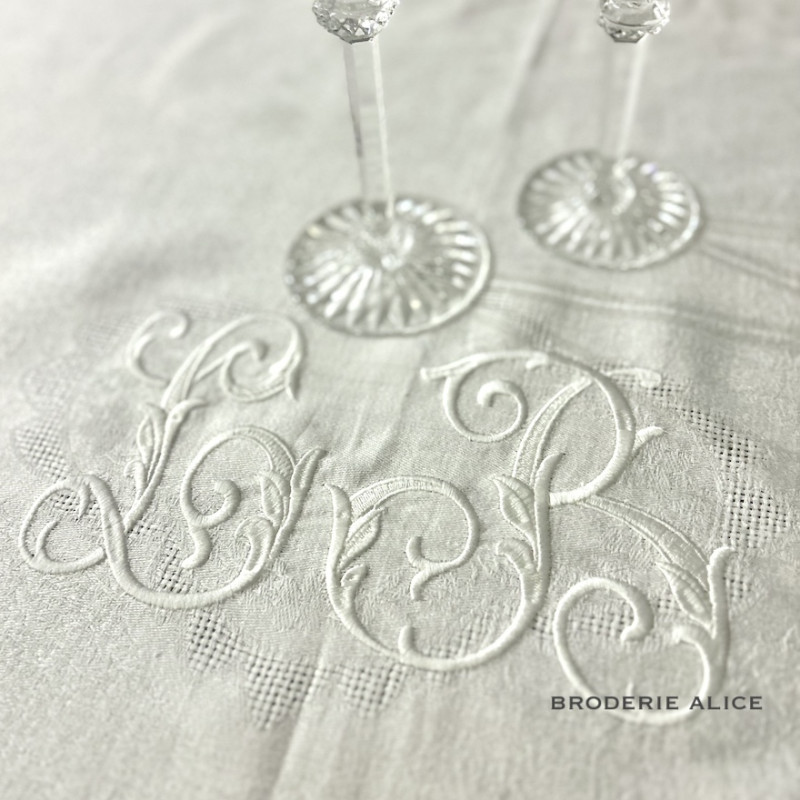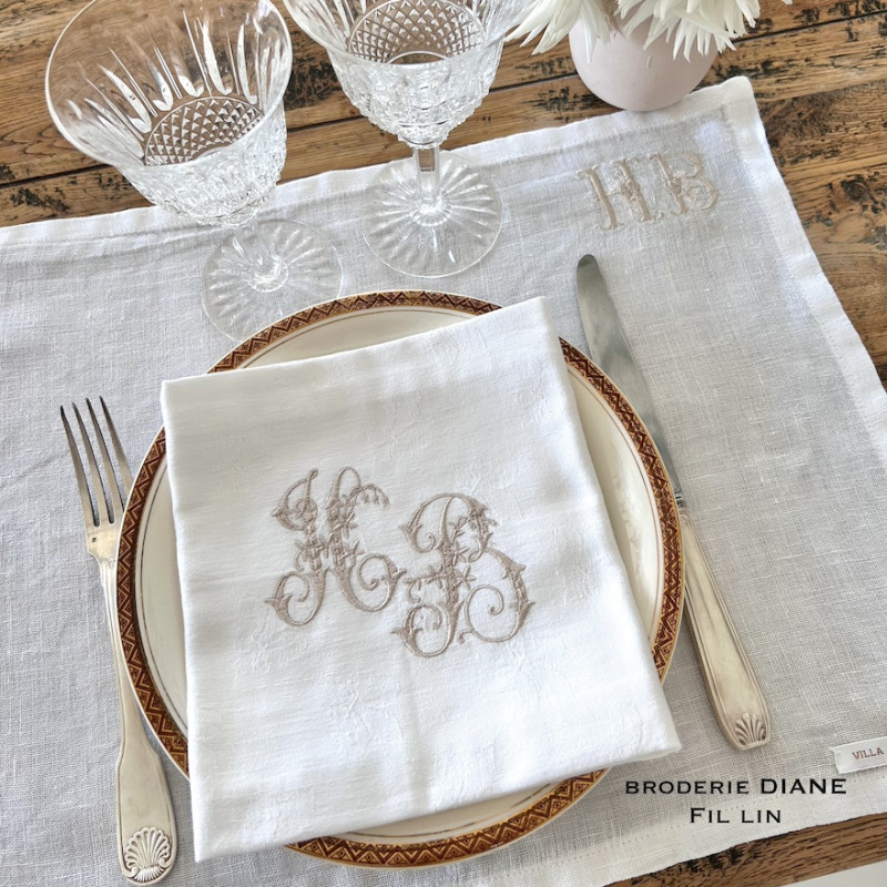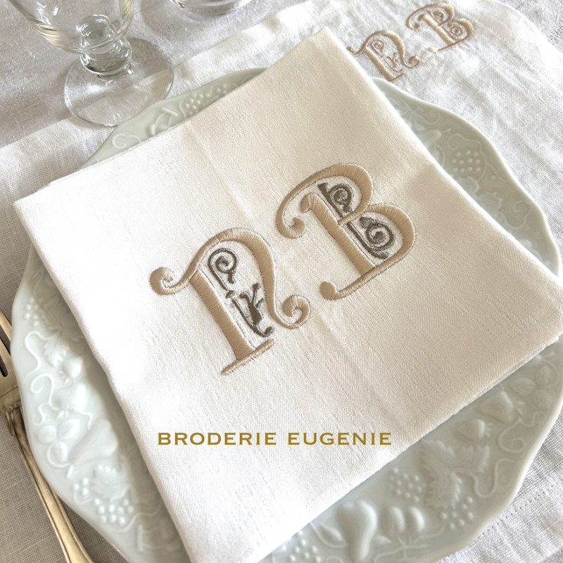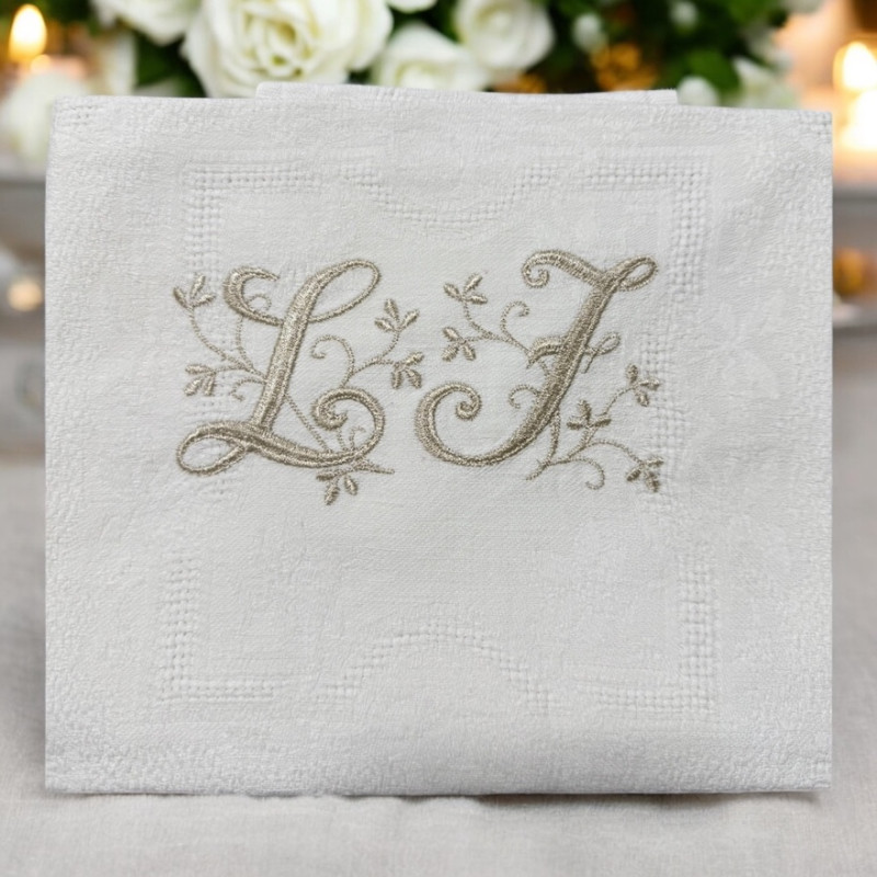 Serviette de table brodée personnalisée, damassé lin vintage. Broderie délicate, romantique, plein de charme 1 initiale ou 2 initiales. Pour une décoration de table chic & authentique - Offert à partir de 6 serviettes, un joli pochon confectionné dans du tissu ancien.