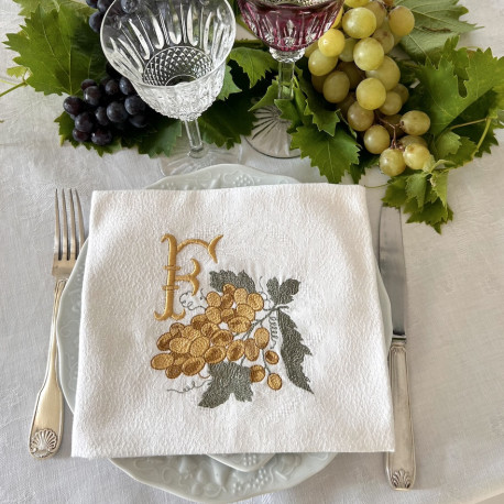 Serviette de table brodée personnalisée damassé vintage à personnaliser à vos initiales. Broderie Vendange RAISIN. Offert à partir de 6 serviettes, un joli pochon confectionné dans du tissu ancien. Pour offrir ou se faire plaisir!