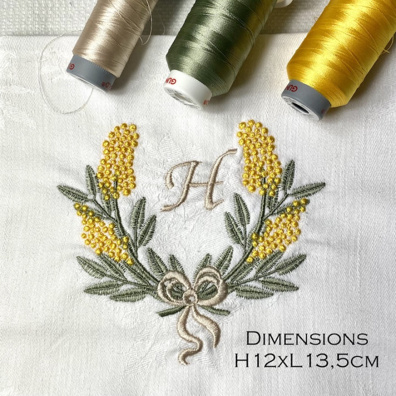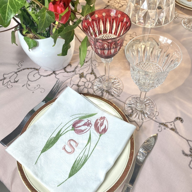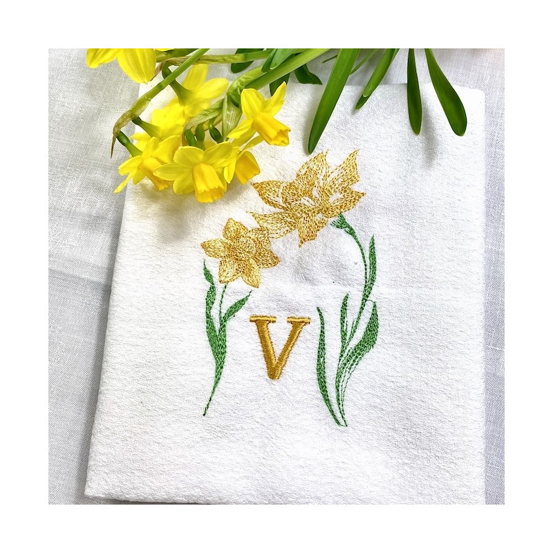 Serviette de table brodée à vos initiales, damassé vintage. Broderie FLEURS, Jonquille, tulipe, mimosas...pleine de charme. Pour une décoration de table chic & authentique