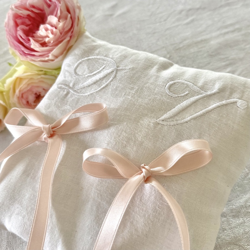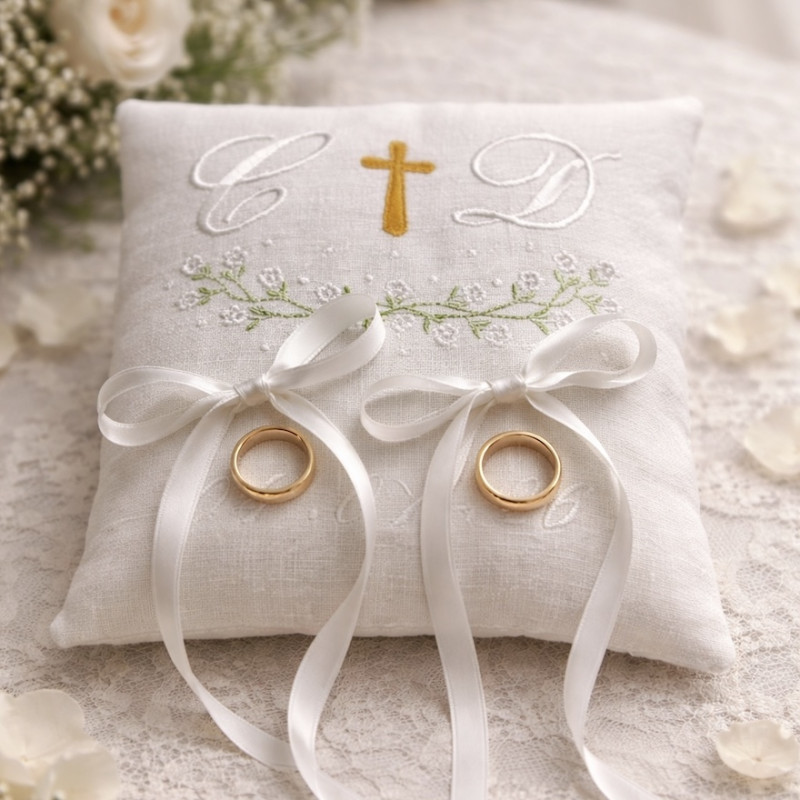 Coussin porte alliances brodé personnalisé à vos initiales, croix, fleurs blanches et date de votre mariage, en lin naturel. Pensé comme un écrin délicat pour deux anneaux chargés d’amour. Plusieurs coloris de ruban satin pour tenir vos alliances. Broderie initiales fil blanc.