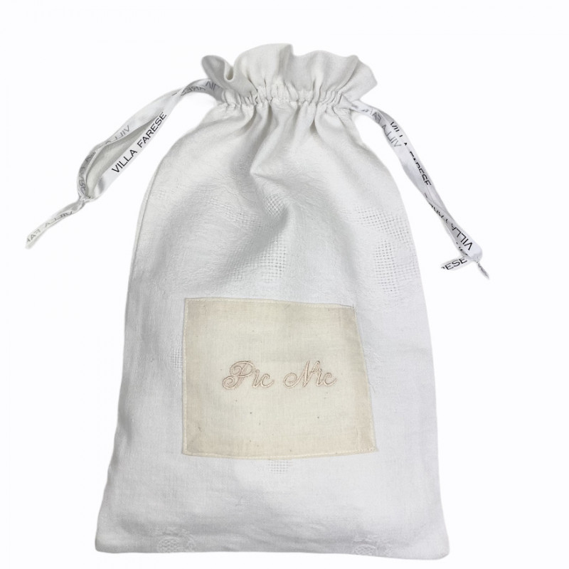 Joli sac brodé PIC-NIC, confectionné dans du tissu ancien 100% coton, avec son lien en satin VILLA FARESE. Pour un pique nique CHIC & AUTHENTIQUE