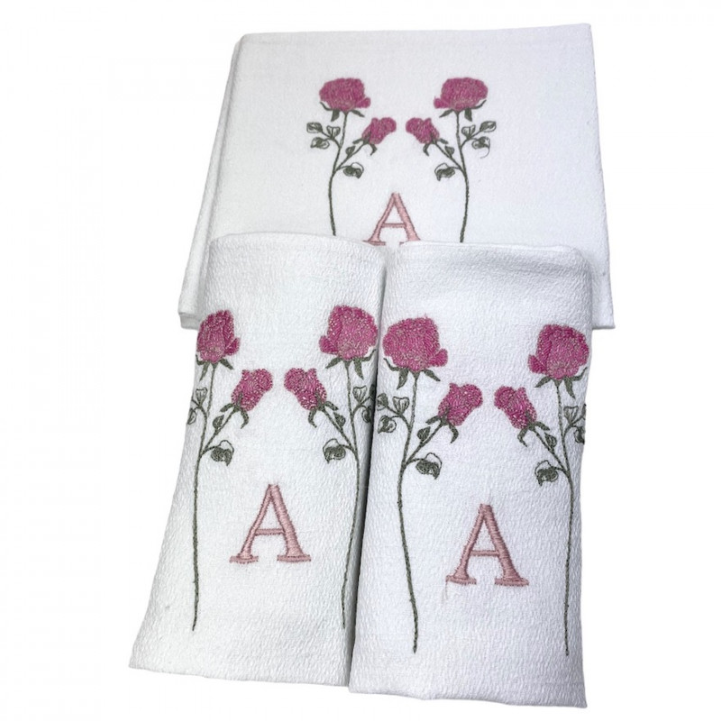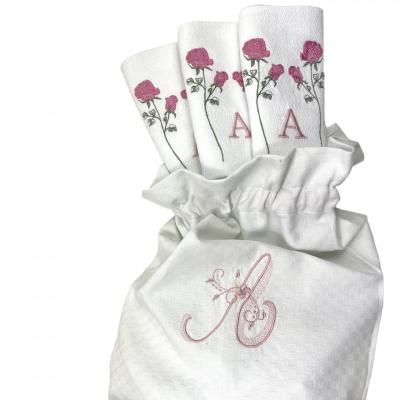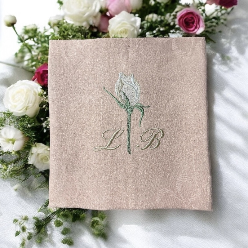 Serviette de table brodée prénom ou initiale damassé vintage. Broderie élégante Boutons de rose, romantique, pleine de charme 1 ou 2 initiales selon le modèle. Pour une décoration de table chic & authentique - Offert à partir de 6 serviettes, un joli pochon confectionné dans du tissu ancien. Pour offrir ou se faire plaisir!