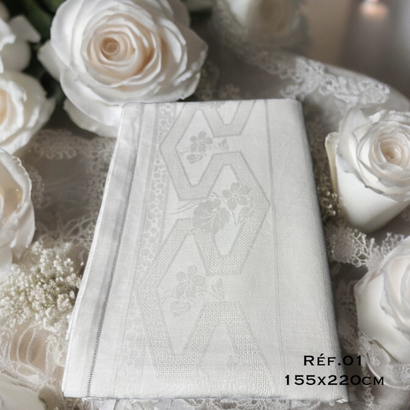 Belle nappe brodée à vos initiales, vintage damassé soie, décor floral, . Choix de Broderies délicates, pleines de charme. Pour une décoration de table chic & authentique. Emballée dans un joli pochon confectionné dans l'atelier OFFERT. Cadeau original ou simplement pour se faire plaisir.