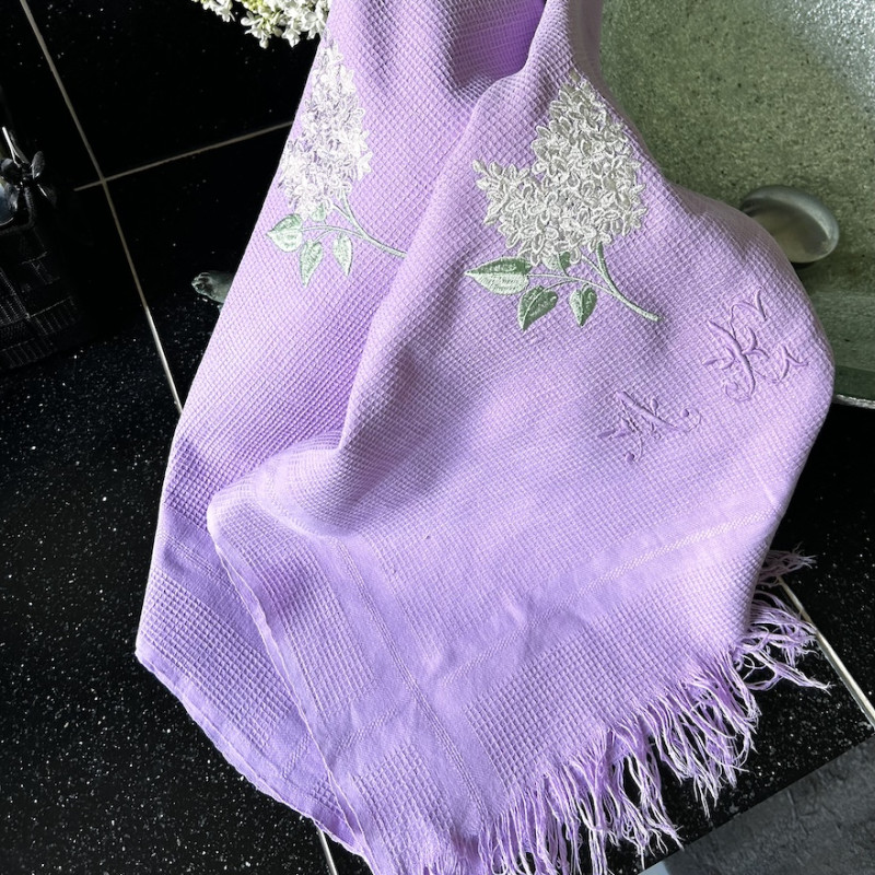 Deux Serviettes de bain brodées vintage , nid d'abeille 100% coton doux et absorbant. Teinture artisanale LILAS. Broderie monogramme fait main AE, broderie fleurs de lilas Blanches et mauve machine. Emballées dans un pochon confectionné dans du tissu ancien. Du charme dans votre salle de bain. Pour offrir ou se faire plaisir!