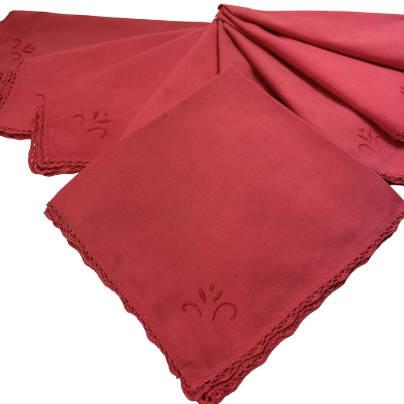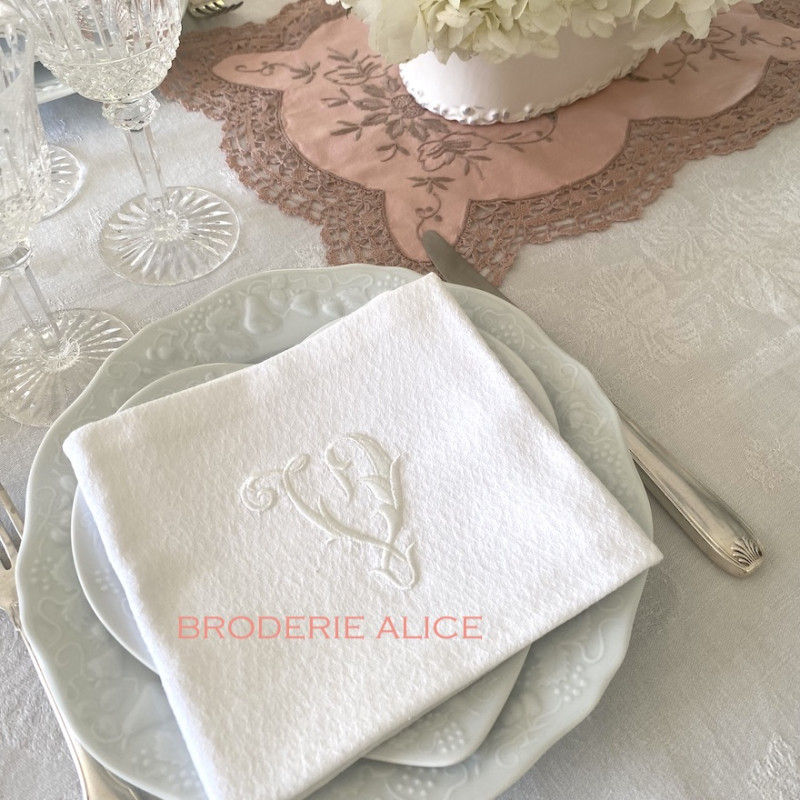 Huit Serviettes de table en coton vintage à personnaliser à votre initiale. Broderie modèle ALICE délicate, romantique, plein de charme 1 initiale. Pour une décoration de table chic & authentique - Offert un joli pochon confectionné dans du tissu ancien.