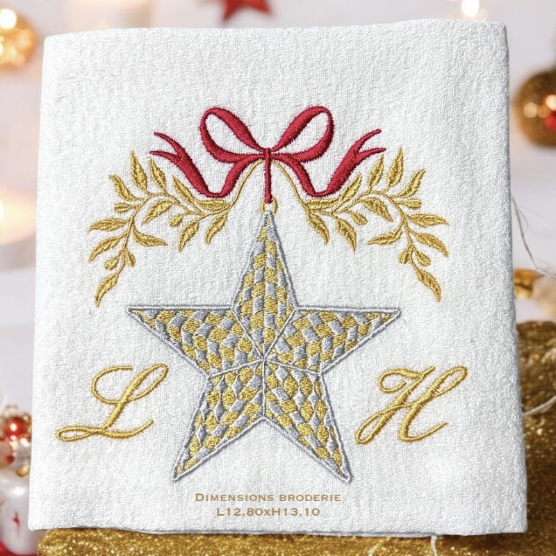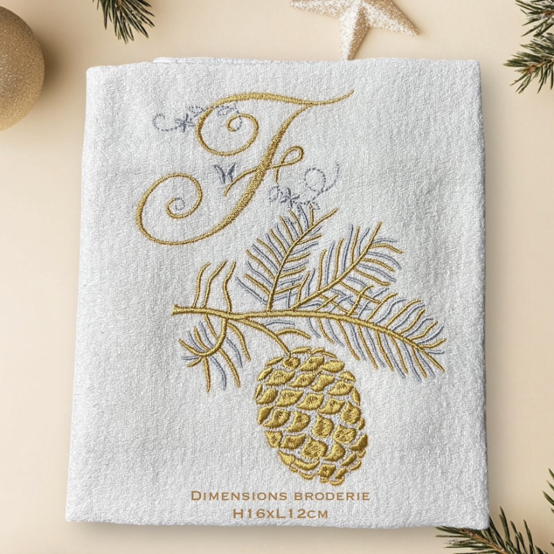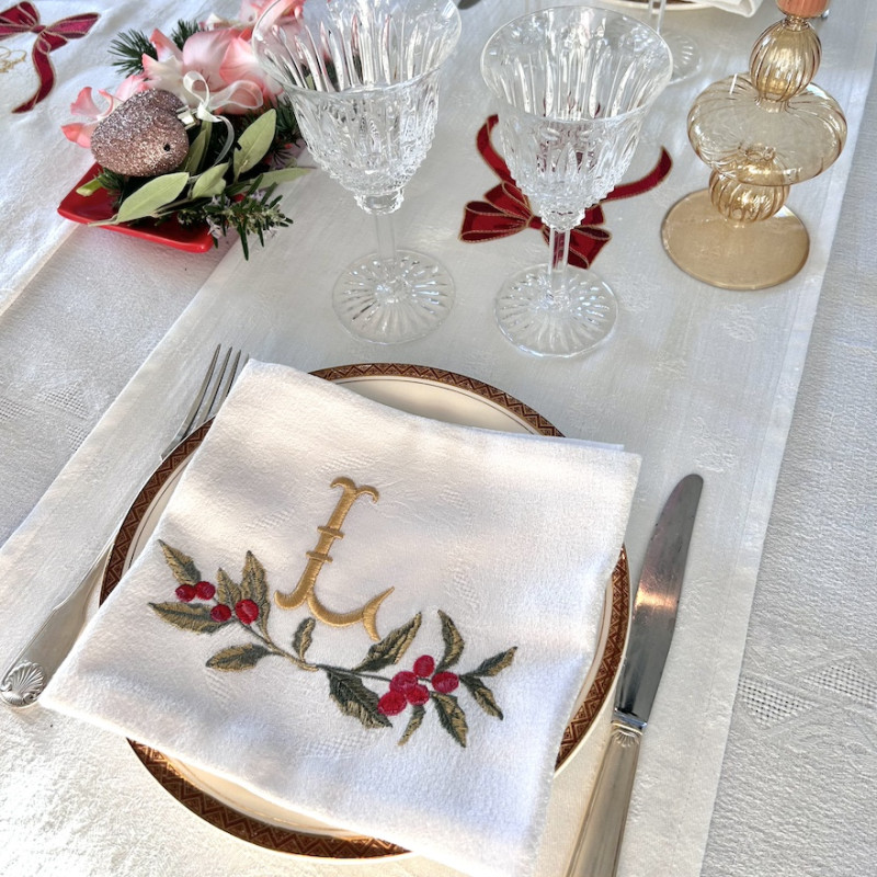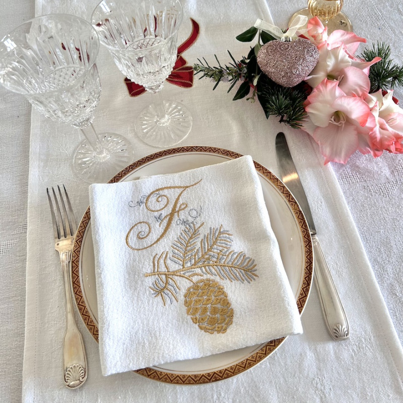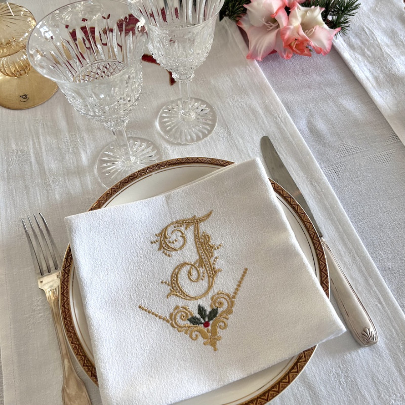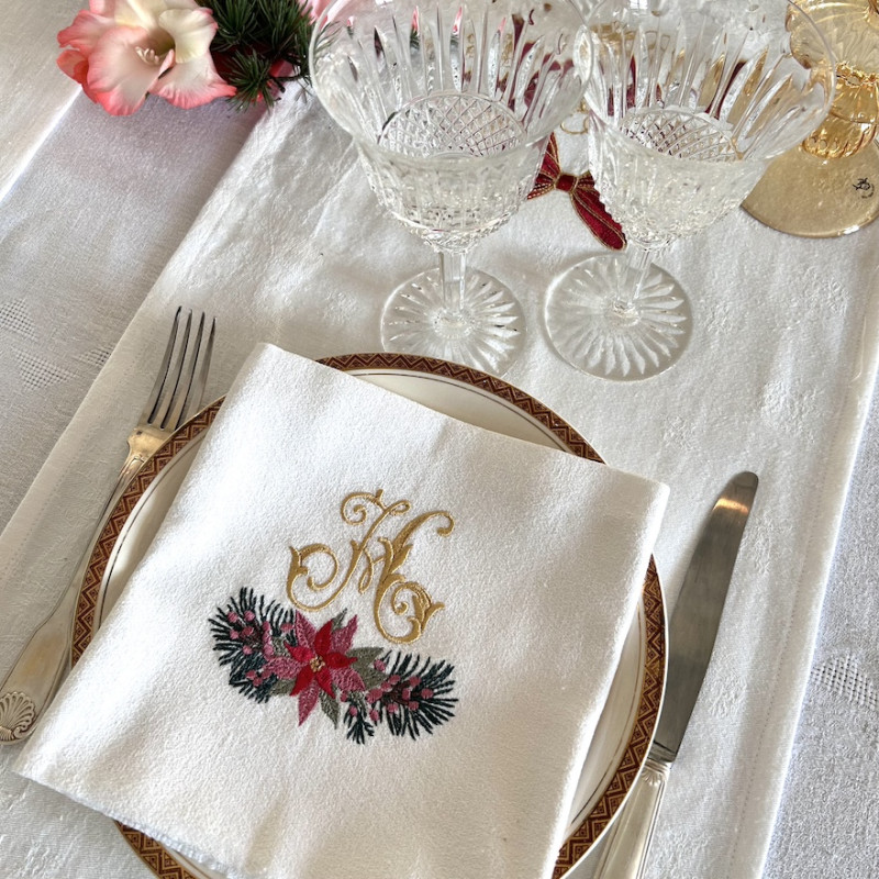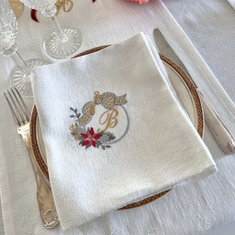 Serviette de table brodée prénom ou initiales, damassé lin vintage. Broderie de NOËL. Pour une décoration de table chic & authentique - Offert à partir de 6 serviettes un joli pochon confectionné dans du tissu ancien. Pour offrir ou se faire plaisir!