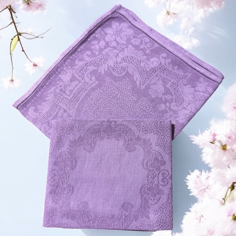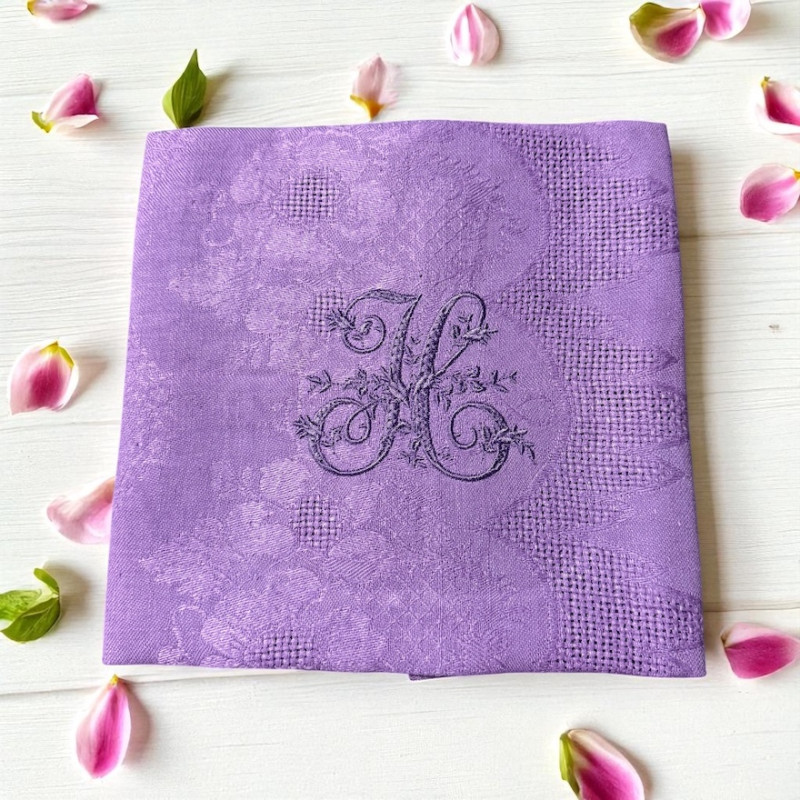 Huit Serviettes de table brodées à personnaliser à vos initiales - Damassé coton vintage. Teinture artisanale LAVANDE - Broderie délicate, romantique, plein de charme 1 initiale ou 2 initiales. Pour une décoration de table chic & authentique - Offert à partir de 6 serviettes, un joli pochon confectionné dans du tissu ancien.