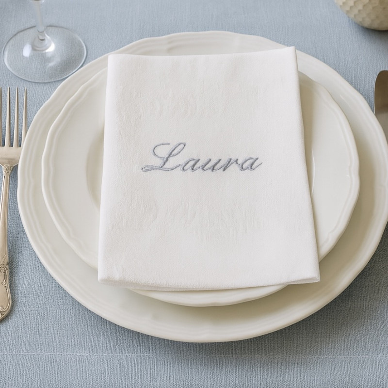 Serviette de table brodée PRENOM, une serviette vintage damassé, un prénom délicatement brodé et l'émotion d'un moment partagé. Offrez à votre table une touche unique et personnalisée. Elégance, douceur et artisanat...chaque détail compte! Offert à partir de 6 serviettes, un joli pochon confectionné dans du tissu ancien.