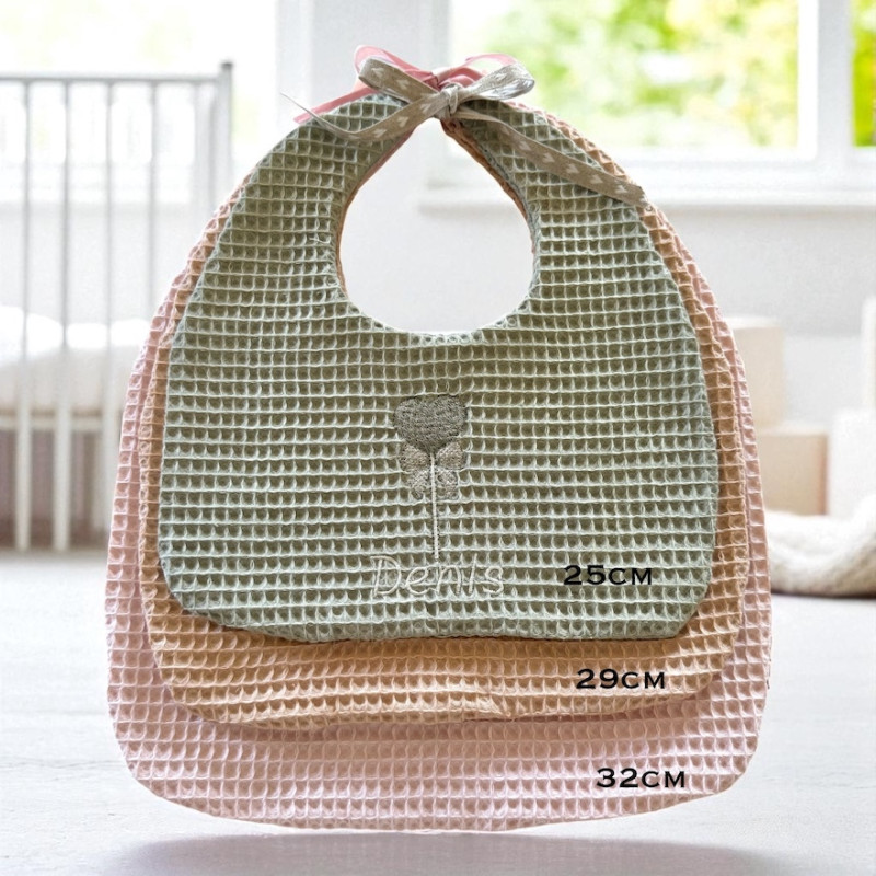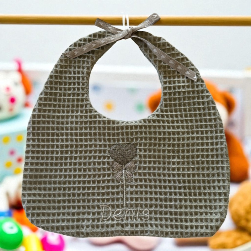 Bavette brodée au prénom de l'enfant, tissu nid d’abeille. Une pièce unique qui allie douceur, élégance et authenticité, confectionnée entièrement à la main