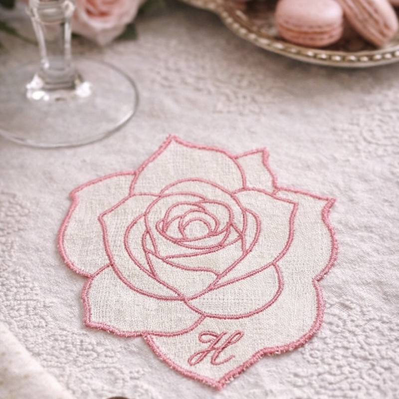 Six dessous de verre brodés à votre initiale en damassé vintage. Façonnés en forme de coeur et de Rose et délicatement brodés, sont pensés pour célébrer les instants partagés, les tables qui rassemblent et les détails qui font toute la différence.