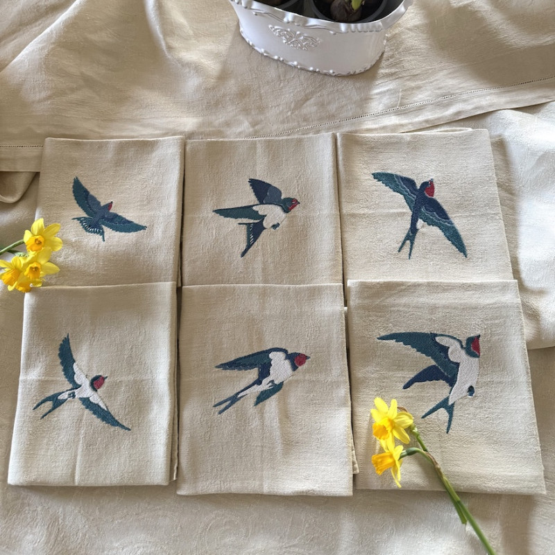 Serviette de table brodée prénom ou initiale, délicatement brodé sur une serviette vintage damassé blanche. Offrez à votre table une touche de printemps avec cette serviette de table ornée d'HIRONDELLES délicatement mis en valeur.