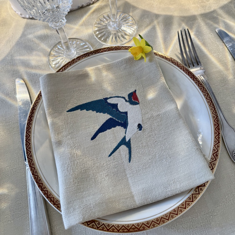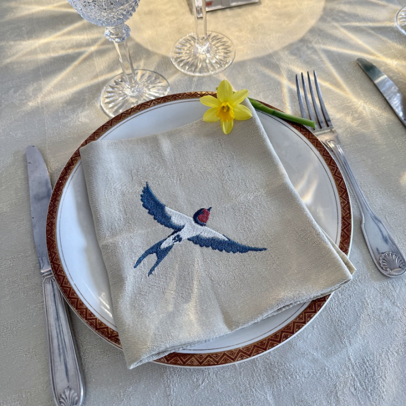 Six Serviettes de table brodées prénom ou initiale, vintage damassé couleur CAMEL, teintée artisanalement. Offrez à votre table une touche de printemps avec cette serviette de table ornée d'HIRONDELLES délicatement mis en valeur.