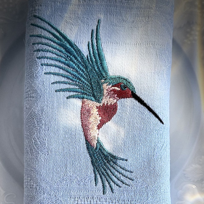 Huit Serviettes de table brodées prénom ou initiale, vintage damassé couleur BLEU AZUR, teintée artisanalement. Offrez à votre table une poésie légère avec ces serviettes de table ornées d'un magnifique COLIBRI délicatement mis en valeur.